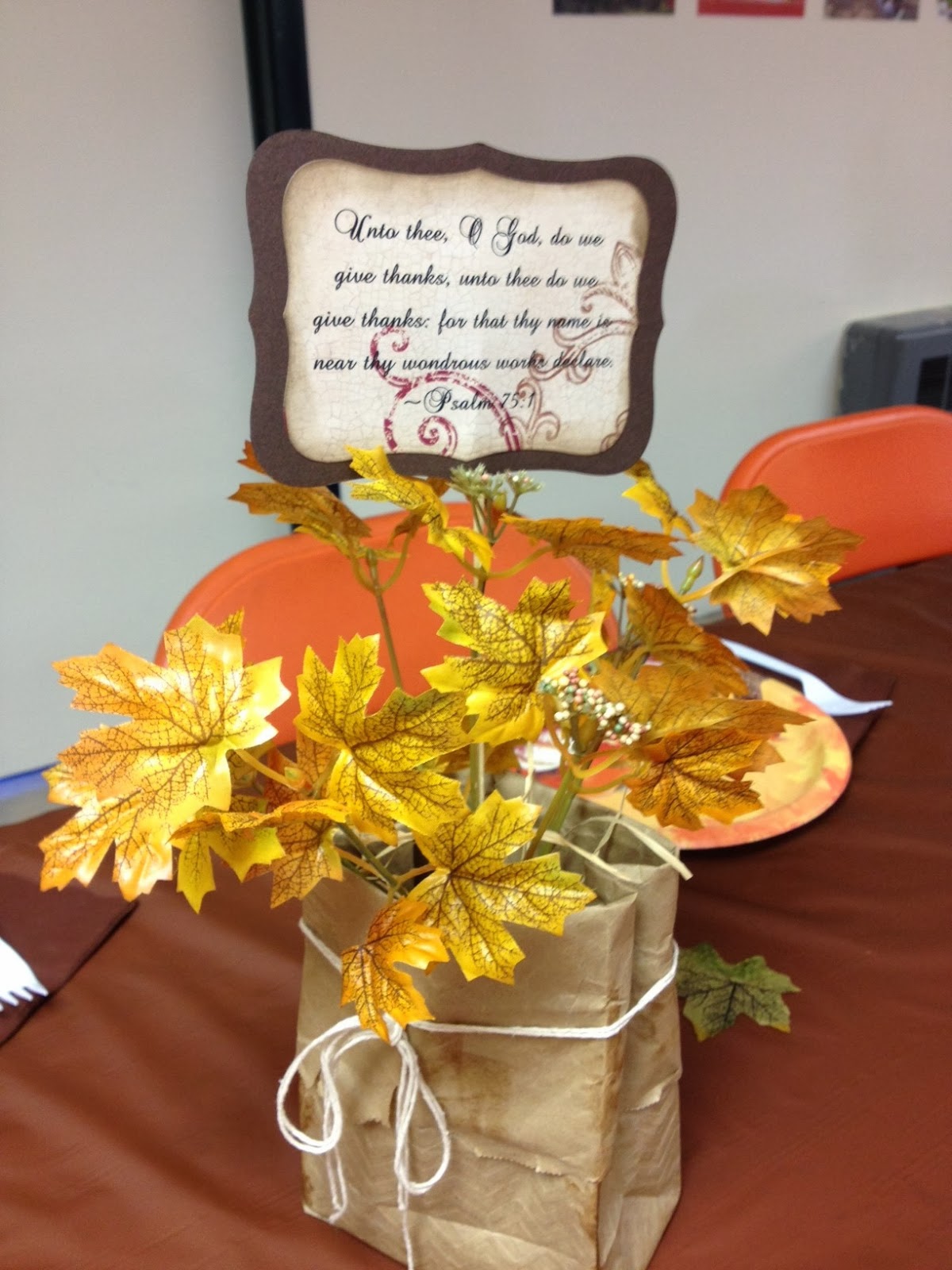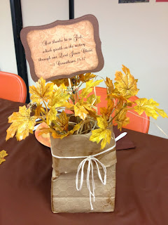On Saturday evening, we just had our Harvest Dinner at our church. I was in charge of the decorations. We did have some cornstalks, hay bales, and mums in the corner, but the main focus was on the tables. Our tables are not very wide and there was going to be some food on them, so whatever I make has to take up pretty small spaces. After searching and trying a few things I did not like, I came up with "bag vases." I didn't get very good pics of the final product, but they worked will with the brown table runner, our orange chairs [ yuck!! :-P ], and a fall theme.