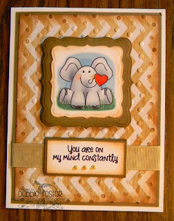 My image is Cookie Warms the Heart digital stamp with a sentiment from Hot Cocoa Sentiments digital stamp. Both are from Sweet 'n Sassy. Cookie is colored with my Spectrum Noir markers. The DP is Recollections "O Christmas Tree." I used Fiskars Threading Water border punch and hand cut the banner.