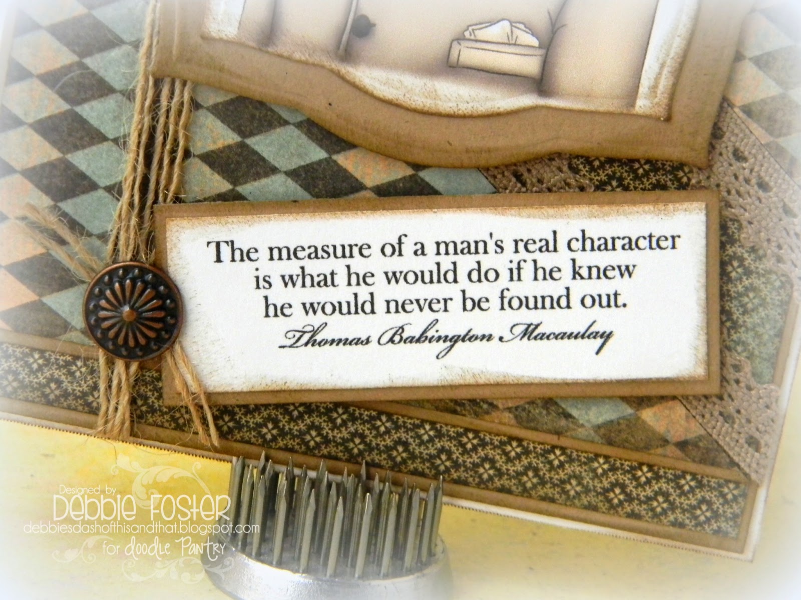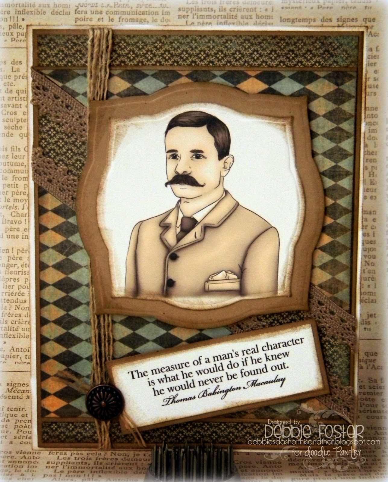My DP is 7 Gypsies Venice, the image is cut out using Spellbinders Labels Three, all edges are inked with TH "walnut stain," the lace is Paper Studio, and the antique copper brad is Making Memories. The 'twine' is a thread pulled from burlap. :)