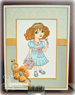 My image is "Cute Girl with Flower Basket" from our sponsor for this week... SLS Lines. It's an Etsy shop full of "digital stamps and papers with a fun and quirky vibe." I colored my image with Spectrum Noir markers. All of my DP was from my scrap pile. My flourish is from Spellbinders Doodle Parts and it is topped with a Prima flower.