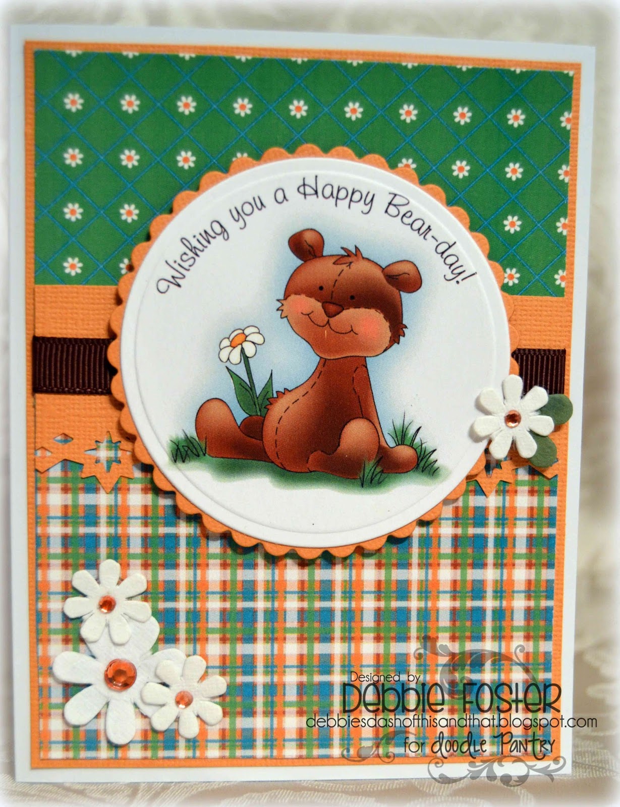 Isn't this little guy adorable?? He's from the Beary Cute COLOR Plus set from Doodle Pantry. The digi paper is also from that set. My image is cut out with Spellbinders Standard Circles and the mat is Petite Scalloped Circles. The flowers are Flora Doodles. The punched border is a Martha Stewart punch.