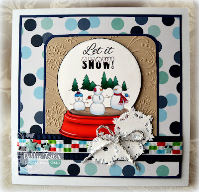I love the muted tones because of the Kraft! I used lighter shades of my Spectrum Noir markers. This DP (all scraps!) is awesome and I love the inked embossing, so this one really make me happy! The image is from Fred, She Said - Emma and the Snowball (if you want to see what the image would have looked like if I had printed it correctly, check it out here), the EF is Darice Snowflake Swirl, and the Merry Christmas is a clear sentiment from M5D.