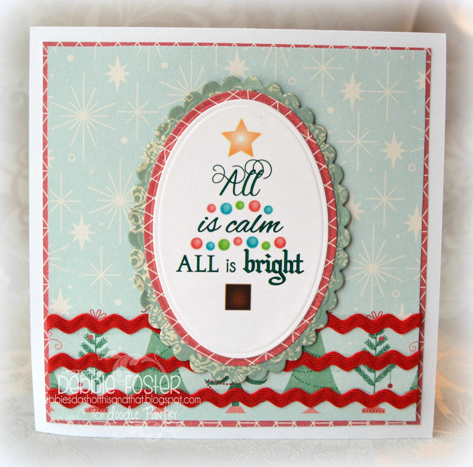 My image/sentiment are from Doodle Pantry - All Is Calm. The DP is AC "Let It Snow." I cut the image and frames with Spellbinders Petite Ovals and Petite Scalloped Ovals. A bit of red rick rack and it was all done!