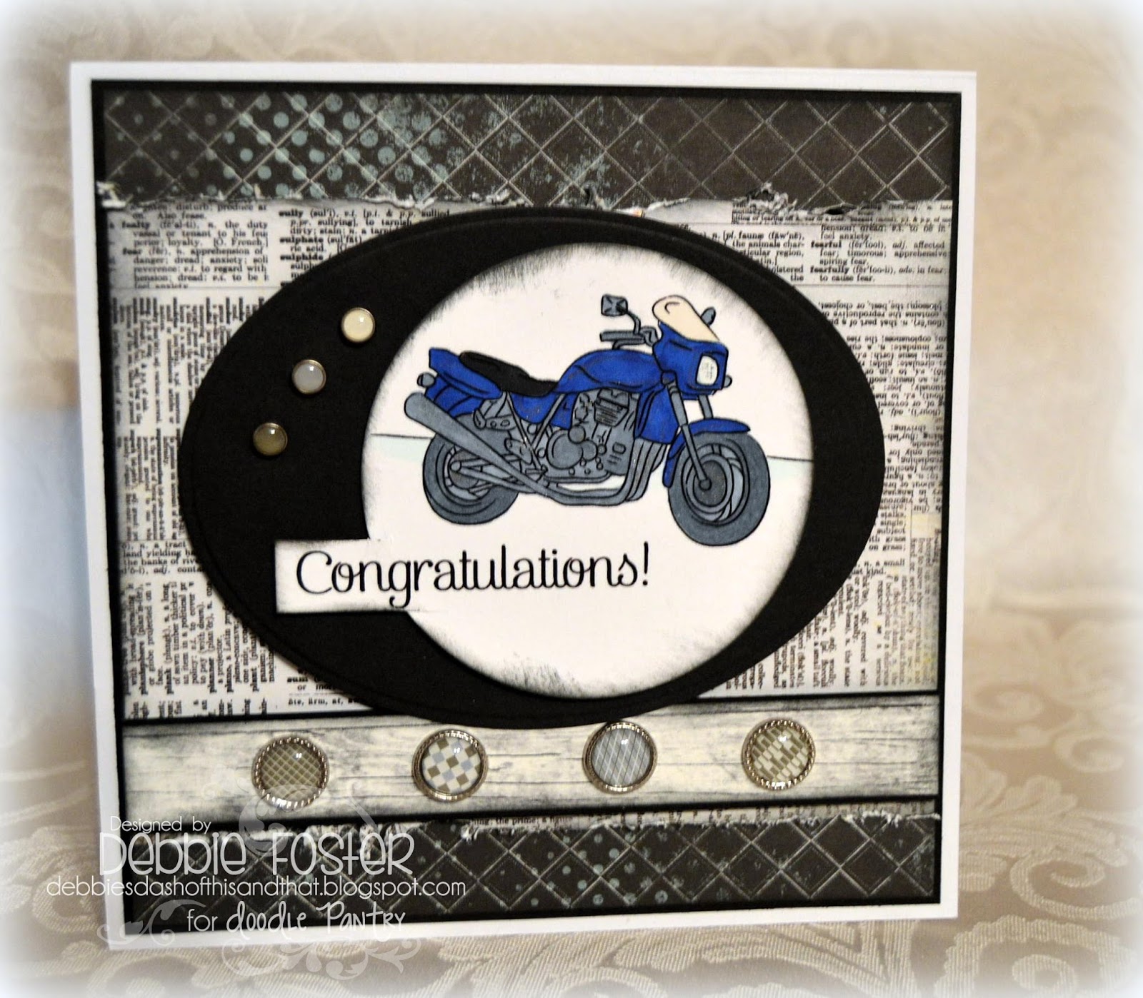 My image is Racing Motorcycle from Doodle Patnry. It's colored with Spectrum Noir markers. The sentiment is from Office Chatter. My DP is Authentique Latest & Greatest. {My previous 2 cards were from this 6x6 paper pad, too, but they are all soooo different! I love pads like that!}