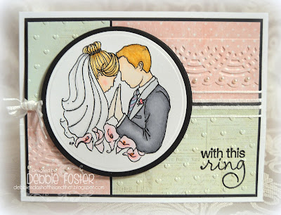 My image is True Love from From the Heart Stamps. It is colored with Spectrum Noir markers and cut out using Spellbinders Standard Circles. The DP is Prima Something Blue. It is embossed with CB Love Language and Darice Lace border. The sentiments are clear sentiments from Stampendous. "to have and to hold..." was cut using Spellbinders A2 Matting Basics A. A scrap of ribbon and some adhesive pearls finished it off.
