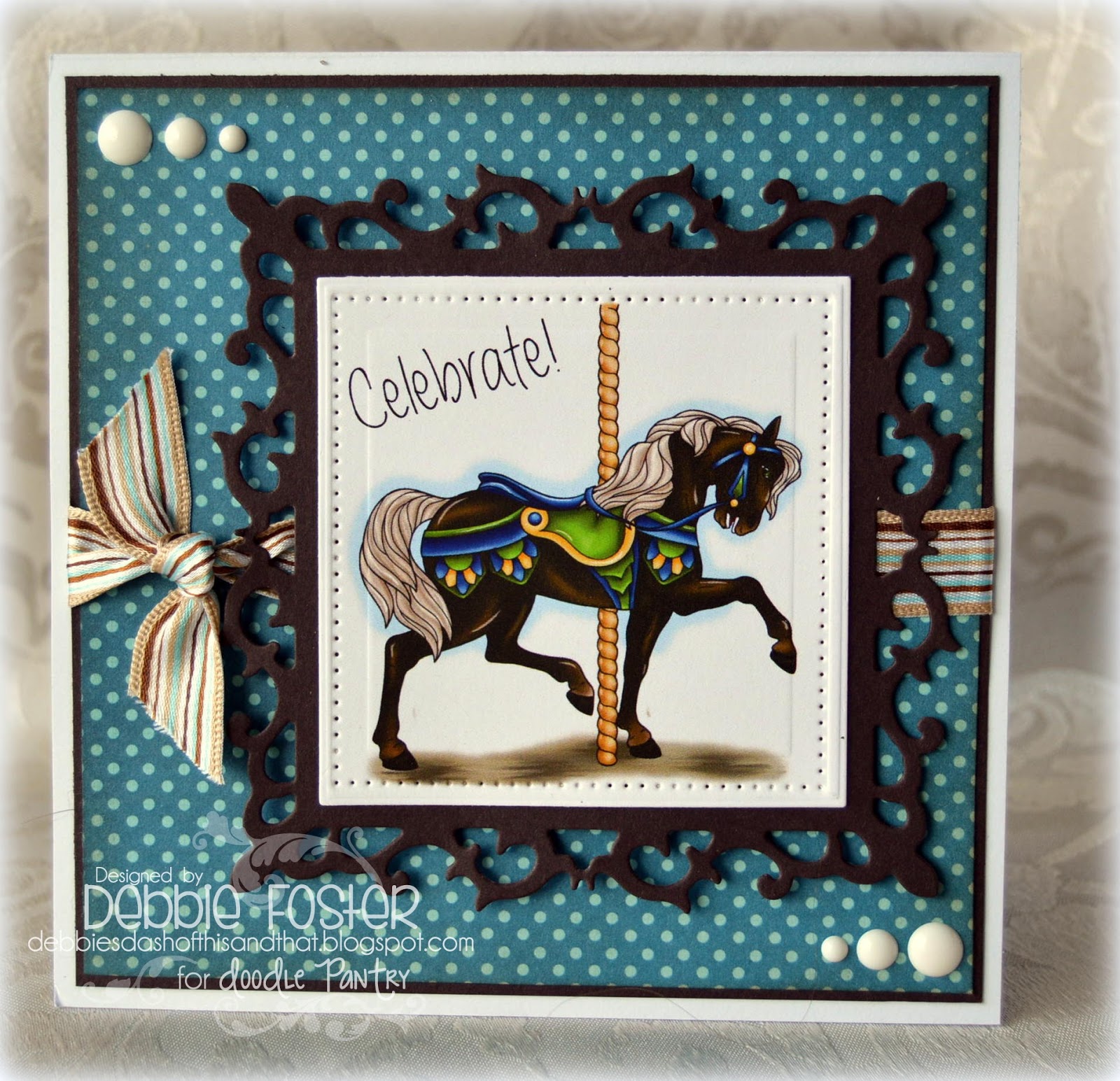 My image is Doodle Pantry's Carousel Horse 6 that is cut out with Spellbinders Celebrations Squares and framed with Spellbinders Fleur de Lis Squares. I tied a piece of Offray ribbon and the white circles are Doodlebug Designs white Sprinkles.