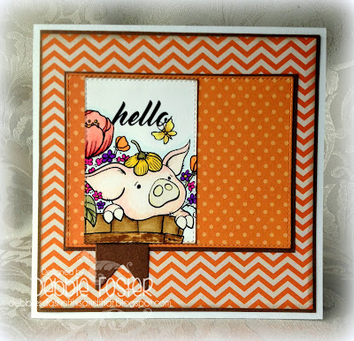 My image is "Hamlet Pigwit in the Planter" from From the Heart Stamps colored with Spectrum Noir markers. The DP is American Crafts Basics. The edges are inked with TH walnut stain. The image and polka dot panel are cut with CottageCutz Stitched Rectangles. The banner die is Sweet 'n Sassy.