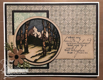 My image and sentiment are "Lead Me Higher" from MHK Designs. The image was printed on Kraft and is colored with Spectrum Noir markers. My paper is 7 Gypsies. I used Spellbinders A2 Matting Basics and Standard Circles. It's finished off with a MS branch punch and a Flora Doodle flower.