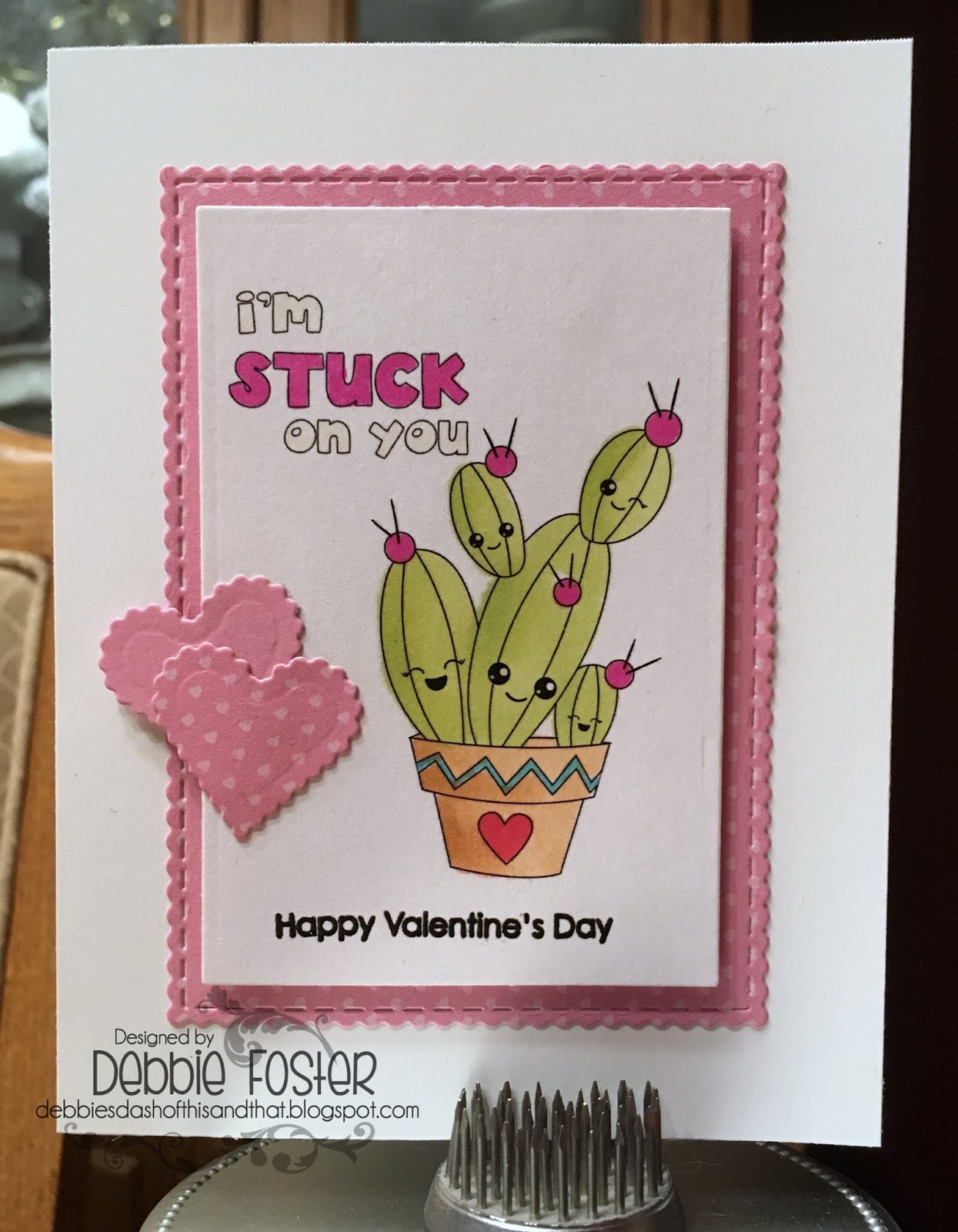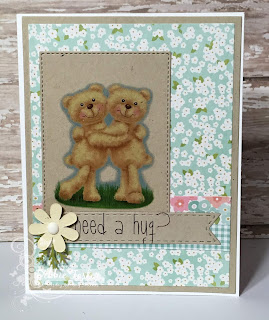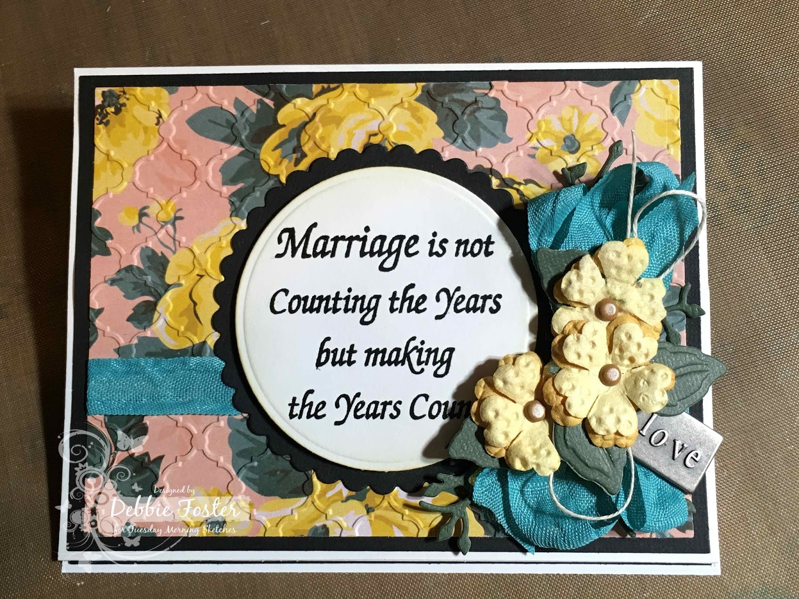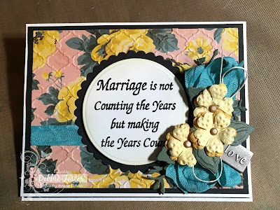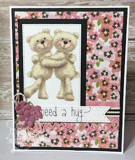My Prima Stationer's Desk DP is embossed with a Lifestyle Crafts EF. My flowers are QuikCutz Rose die cut from scraps. My clear sentiment is Raisin Boat Stunning Silhouettes stamped with Versafine Onyx Black and clear heat embossed. Ribbon and brad are from my stash.